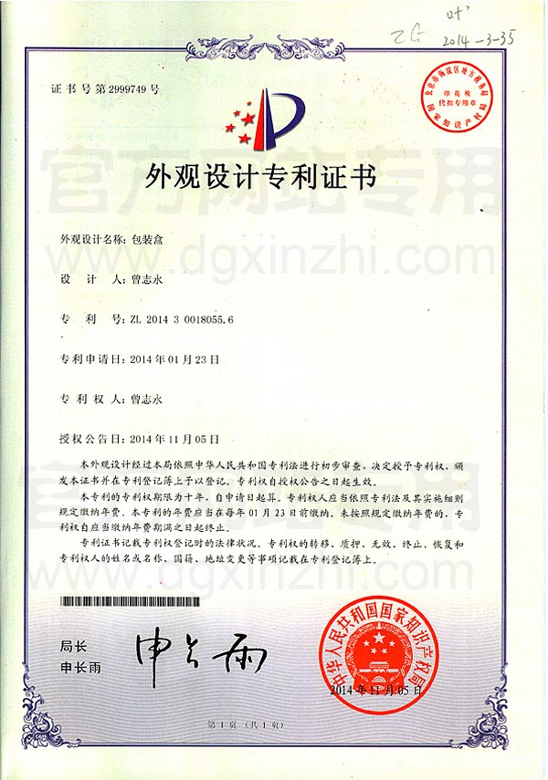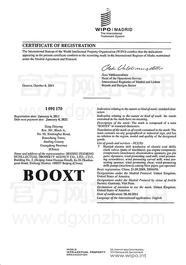 國(guó)際知識(shí)產(chǎn)權(quán)組織(WIPO)認(rèn)證證書