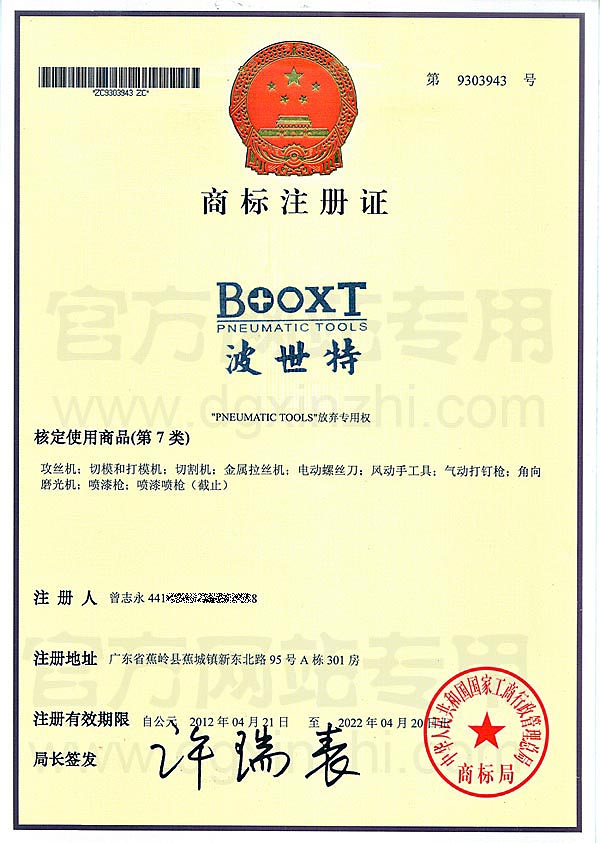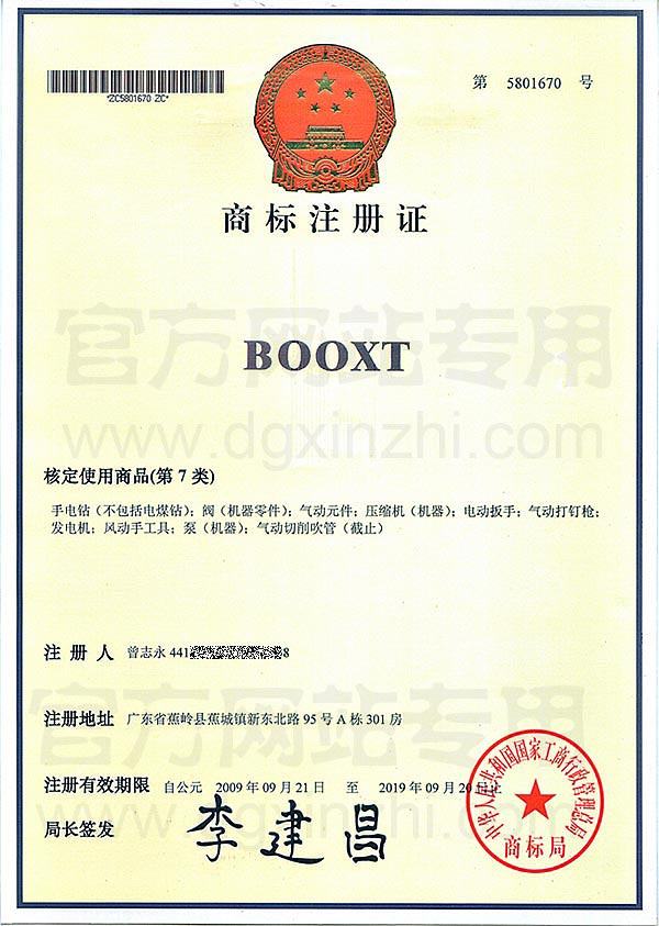 BOOXT第7類商標(biāo)注冊(cè)證